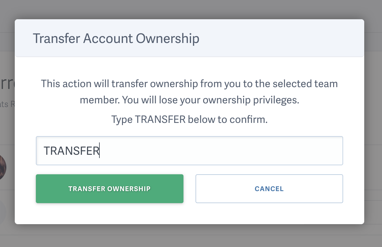 After clicking the crown icon, a confirmation modal will appear. You must type “TRANSFER” in the text input box, then click “Transfer Ownership” to confirm your change.